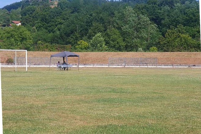 Na sredini travanjaka nalazi se sto za odbornike, a 100 metara dalje je mali stol – sa jedne strane terena je Mehmed Dubravac, a sa druge Meša Jašarević.