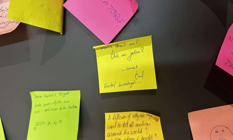 Na desetinama papirića ispisane su poruke tuge, boli, nevjerice, ali i nade. Neki su napisali samo jedno ime, drugi su ostavili cijele rečenice: „Nikad nećemo zaboraviti“, „Oprostiti ne možemo“, „Osjećam tugu koju ne znam opisati“.