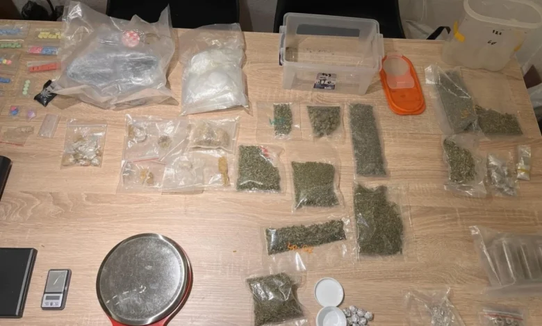 “U izvršenim pretresima na području Starog Grada, pronađeno je i oduzeto 10 različitih pakovanja suhe zeljaste materije koja asocira na opojnu drogu marihuanu, ukupne mase više od 800 grama; tri pakovanja bijele praškaste materije koja asocira na opojnu drogu speed, ukupne mase više od 130 grama; jedan PVC paketić opojne droge kokain, jedna digitalna vaga, određen iznos gotovog novca, te drugi predmeti od interesa za istragu”, saopćeno je iz MUP-a KS.
