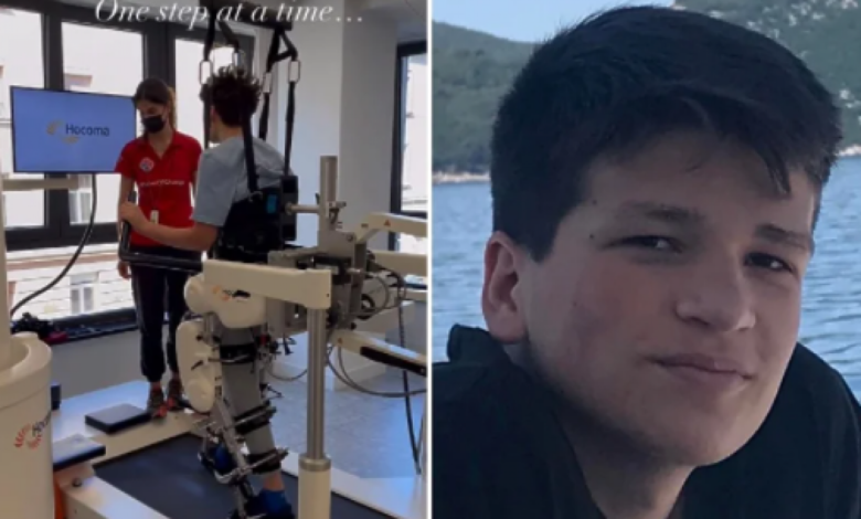Snimak prikazuje 17-godišnjeg Orhana dok uz pomoć medicinskog uređaja polako korača na traci.