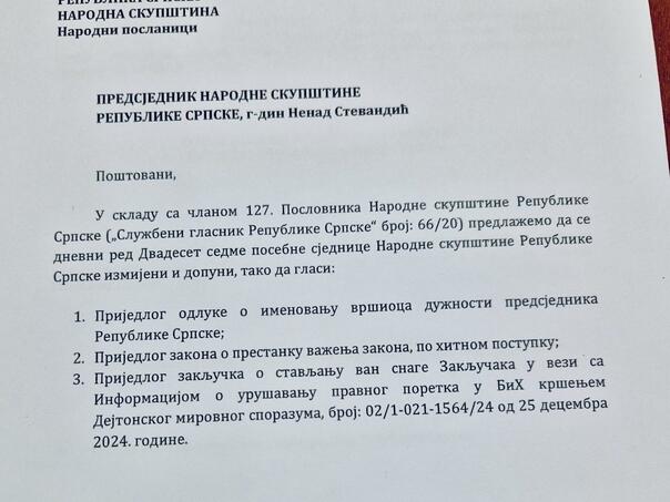 – Narodna skupština Republike Srpske konstatuje da neustavni Tužilaštvo BiH i Sud BiH vode politički montiran proces protiv predstavnika Republike Srpske, a koji se zasniva na nezakonito nametnutim odlukama Kristijana Šmita a iz razloga jer su predstavnici Republike Srpske postupali isključivo u skladu sa ustavnim i zakonskim ovlašćenima i obavezama u okviru zakonodavnog postupka čiji je nosilac Narodna skupština Republike Srpske, te u skladu sa tim zahtijeva od istih da odmah obustave ovaj politički montiran proces.