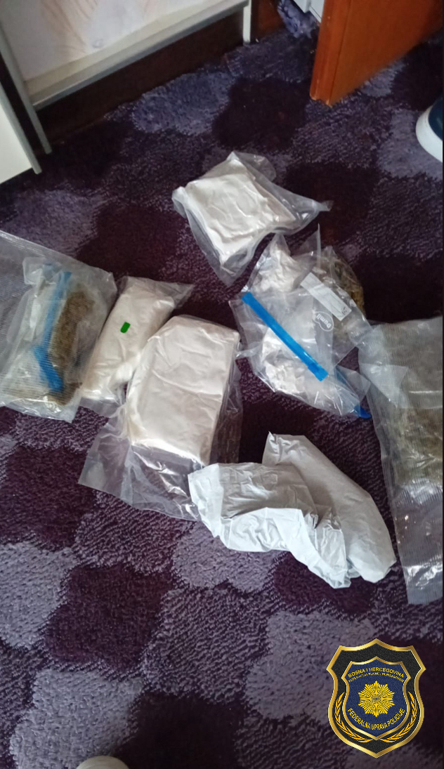 Prilikom pretresa, pronađena su tri kilograma materije koje svojim izgledom asocira na opojnu drogu, vage za precizno vaganje, kao i drugi dokazi koji se mogu dovesti u vezu sa izvršenjem krivičnog djela.