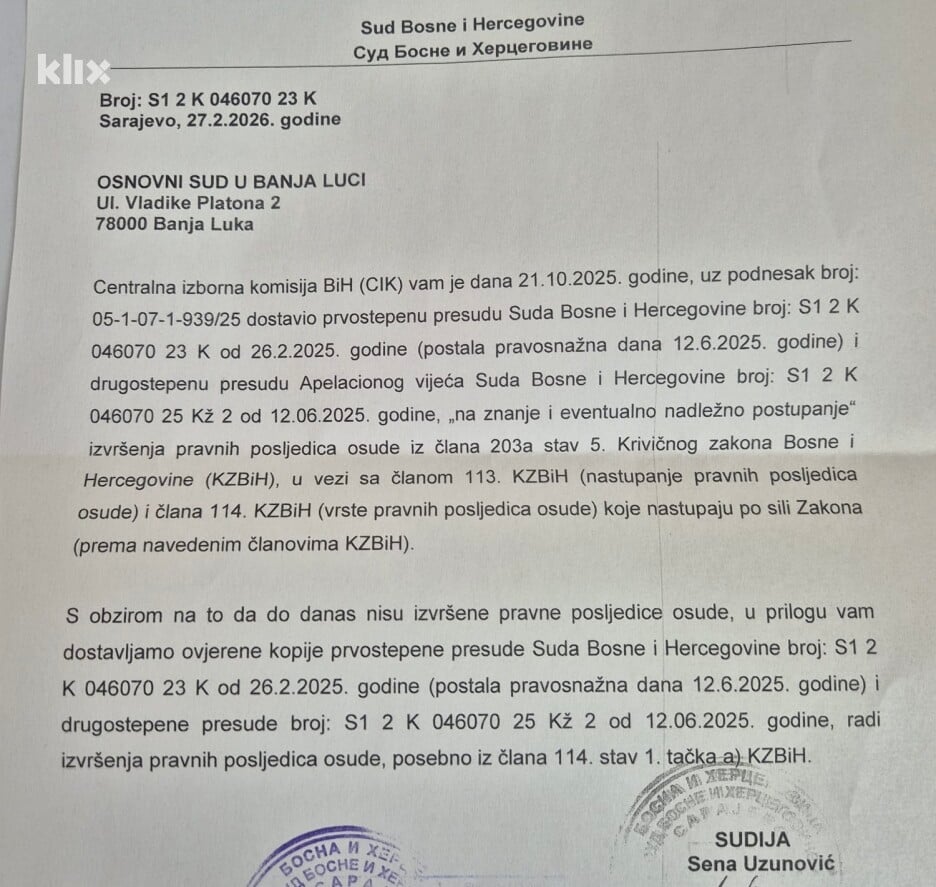 “Centralna izborna komisija BiH vam je dana 21.10.2025. godine dostavila prvostepenu presudu Suda BiH (postala pravosnažna 12.6.2025. godine) i drugostepenu presudu Apelacionog vijeća Suda BiH ‘na znanje i eventualno nadležno postupanje’ izvršenja pravnih posljedica osude iz člana 203a stav 5. Krivičnog zakona BiH, u vezi sa članom 113. KZBiH (nastupanje pravnih posljedica) i člana 114. KZBiH (vrste pravnih posljedica osude) koje nastupaju po sili Zakona (prema navednim članovima KZBiH)”, navodi se u dopisu Suda BiH koji je potpisala sutkinja Sena Uzunović 27. februara ove godine.