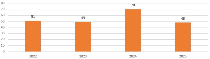 Iz grafikona je vidljivo da je broj novooboljelih od malignih neoplazmi u periodu 2022–2025. godine varirao. Najmanji broj zabilježen je 2025. godine (48), dok je najveći broj novooboljelih evidentiran 2024. godine (70).