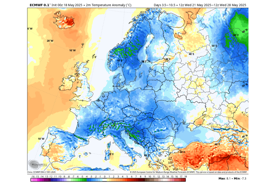 Početak ljeta bi mogao biti razmjerno stabilan, s nešto blažim temperaturama u središnjim i sjeveroistočnim dijelovima Evrope. Visoki pritisak iznad sjevernog Atlantika i južne Evrope, te niski pritisak nad sjeveroistokom kontinenta, mogli bi uspostaviti sjeverozapadni tok koji donosi svježinu i stabilnije uvjete u središnjem dijelu.