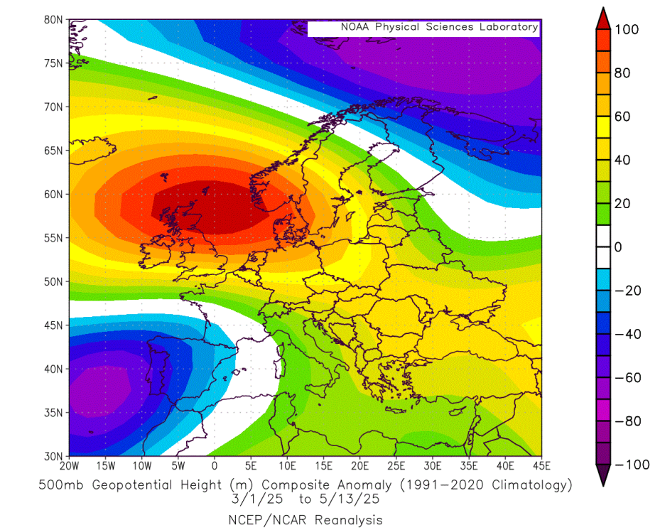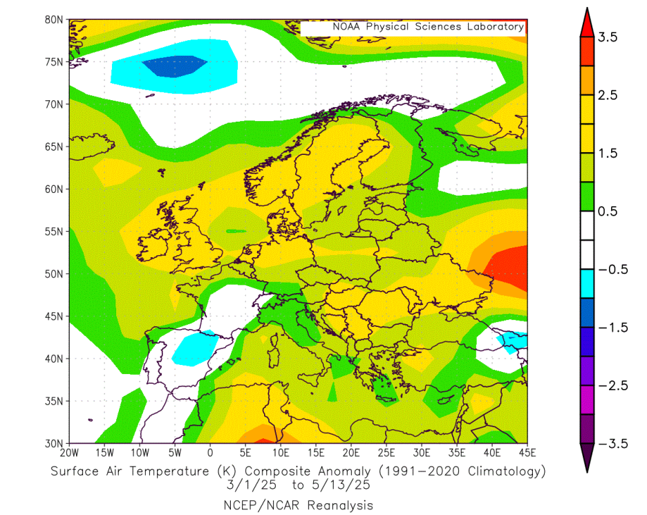 Meteorološko proljeće (mart–maj) 2025. obilježeno je izraženim atmosferskim pritiskom koji je formirao dominantan visoki pritisak nad sjeverozapadnom Evropom. Cikloni su u velikoj mjeri izbjegavali centralni dio kontinenta, zadržavajući se uglavnom iznad jugozapadnih i krajnjih sjeveroistočnih dijelova Evrope. Rezultat je bio jasan – veći dio kontinenta bilježio je temperature iznad sezonskog prosjeka.