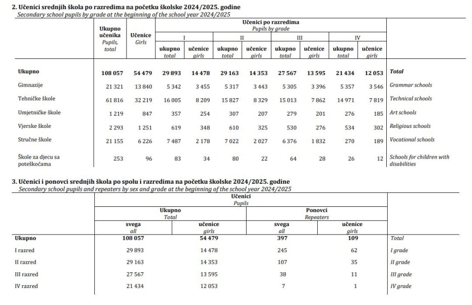 U školskoj 2024/2025. godini u BiH u 314 srednjih škola upisano je 108.057 učenika, što je u odnosu na prethodnu školsku godinu više za 317 učenika, ili za 0,3 posto.