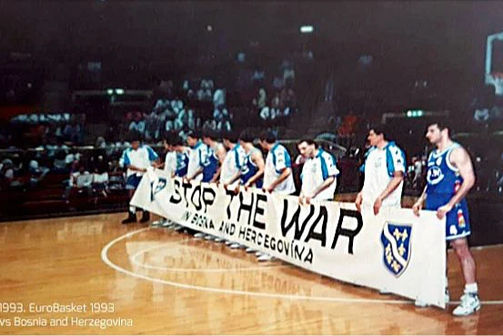 Na prvom meču protiv Rusije 22. juna naši košarkaši su izašli na parket s transparentom “Zaustavite rat u Bosni i Hercegovini” i na taj način skrenuli pažnju svjetske javnosti na agresiju na našu državu.