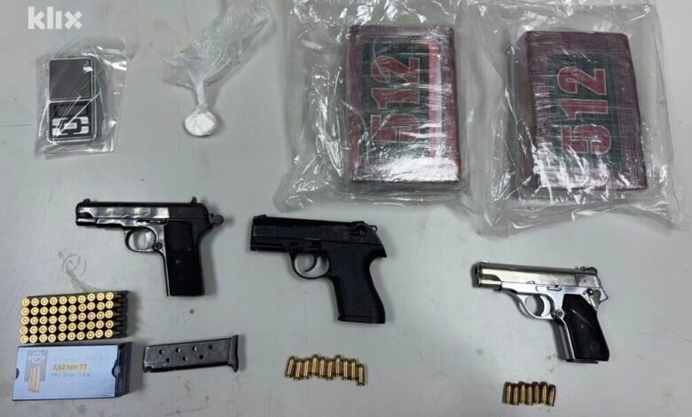 “Tokom pretresa stanova, vozila i drugih prostorija koje koriste osobe E.K. (1997), E.S. (1997), H.Š. (1996) i A.B. (1986), pronađeni su i privremeno oduzeti: ranac sa većim pakovanjem materije bijele boje, za koju je vještačenjem utvrđeno da je riječ o kokainu u količini od 2,012 kilograma, tri pištolja, veća količina municije, digitalna vaga za precizno vaganje, više mobilnih telefona, te novac u iznosu od 300 eura i 530 KM”, kazali su iz Uprave policije MUP-a TK