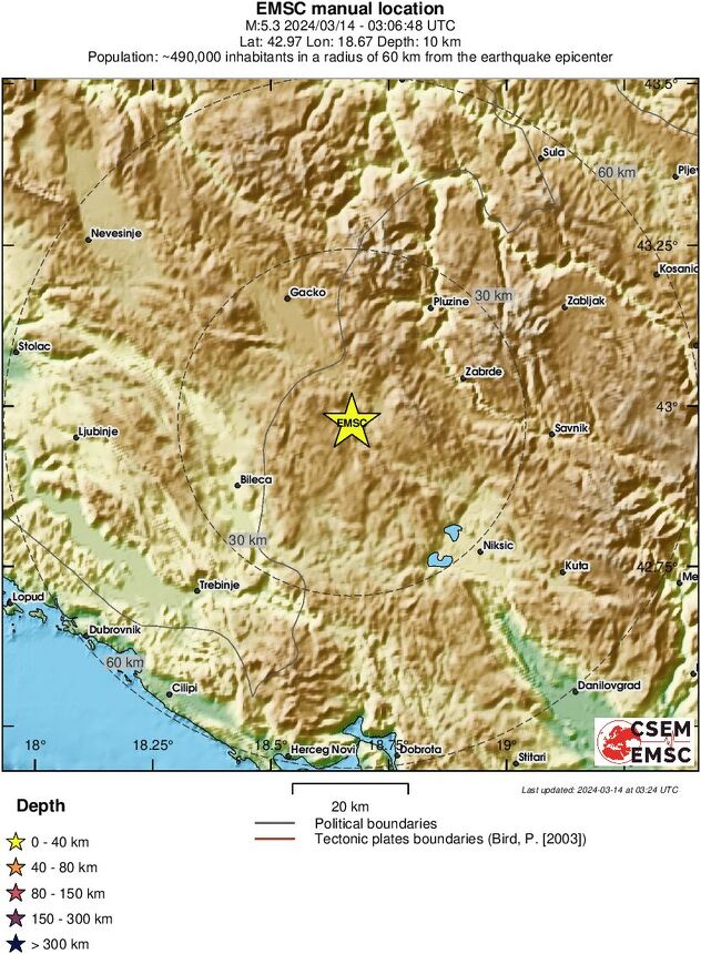 Epicentar se stvorio na 10 kilometara dubine, 30-ak kilometara sjeverno od Nikšića, na granici s Bosnom i Hercegovinom.