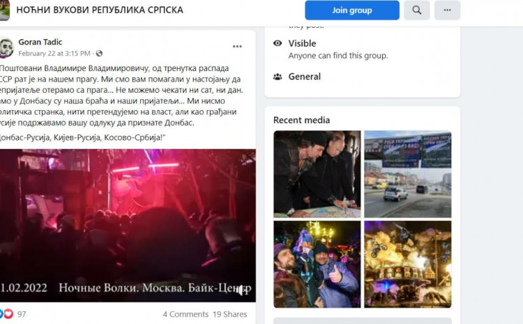 Tadić je na ovu grupu postavio i videosnimak na kojem Alexander Zaldostanov, osnivač i vođa Noćnih vukova iz Rusije, između ostalog, zahvaljuje predsjedniku Rusije Vladimiru Putinu na priznanju Donbasa i navodi kako su Vukovi pomogli u naporima da se “neprijatelj otjera sa praga” ali da ne mogu više čekati ni sat jer su u ukrajinskoj okupiranoj teritoriji Donbasu “braća i prijatelji”.