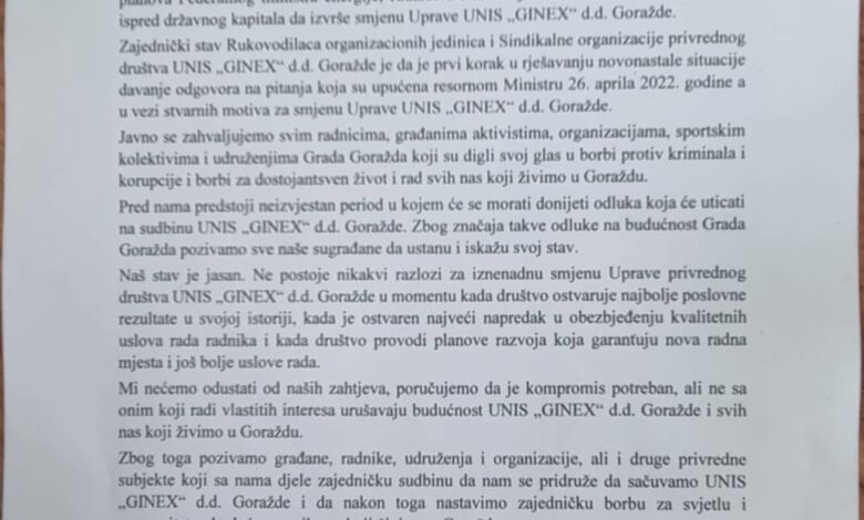 “Naš stav je jasan, ne postoje nikakvi razlozi za iznenadnu smjenu Uprave privrednog društva u momentu kada ostvarujemo najbolje poslovne rezultate u svojoj historiji, kada je ostvaren najveći napredak u obezbjeđenju kvalitetnih uslova rada i kada društvo provodi planove razvoja sa garancijom novih radnih mjesta i još boljih uslova rada. Mi nećemo odustati od naših zahtjeva i poručujemo da je kompromis poteban, ali ne sa onima koji radi vlastitih interesa urušavaju budućnost UNIS Ginexa i svih nas koji živimo u Goraždu”, istakli su, između ostalog, u saopćenju za javnost.