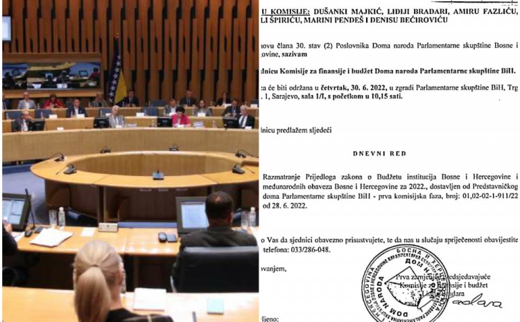 Održana je sjednica Komisije za finansije i budžet Doma naroda Parlamentarne skupštine BiH na kojoj je razmatran Prijedlog zakona o Budžetu institucija za 2022. godinu, koji je je dostavljen od strane Predstavničkog doma PS BiH 28. juna 2022. godinu.