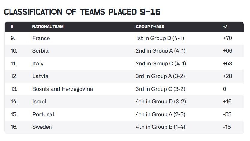 Tako je 9. mjesto na Eurobasketu zauzela Francuska koja je bila 1. u grupi D, a 10. je pripalo Srbiji ispred Italije iako su obje ekipe završile kao drugoplasirane u svojim grupama i to sa identičnim skorom (4-1), ali je Srbija imala bolju koš-razliku (+66 naspram +63).