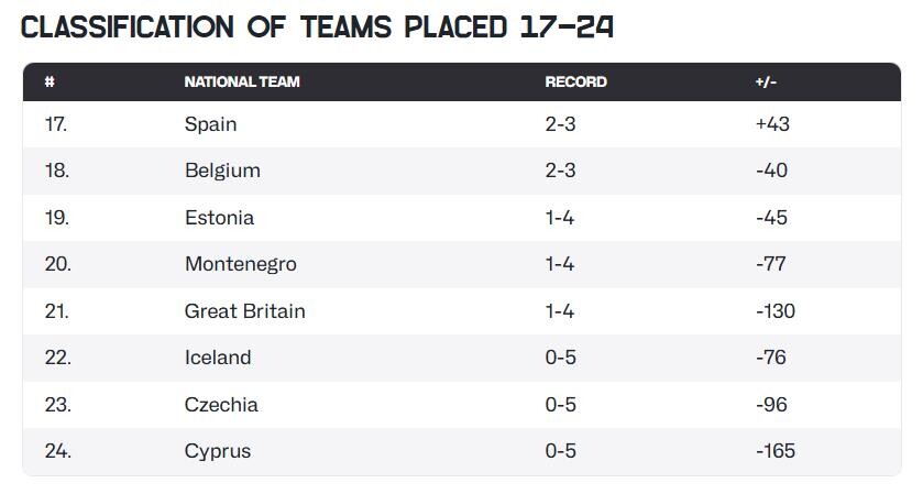 Na osnovu istog kriterija, koš-razlike (+28 naspram 0), Latvija je završila na 12., a Bosna i Hercegovina na 13. mjestu iako su obje ekipe bile treće u svojim grupama sa skorom 3-2.
