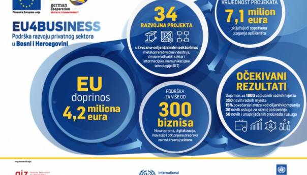 EU4Business projekt zajedno provode GIZ, ILO i UNDP, od aprila 2018. godine do marta 2022. godine. EU4Business dio je Programa za lokalnu samoupravu i ekonomski razvoj u BiH vlade SR Njemačke, saopćeno je GIZ-a.