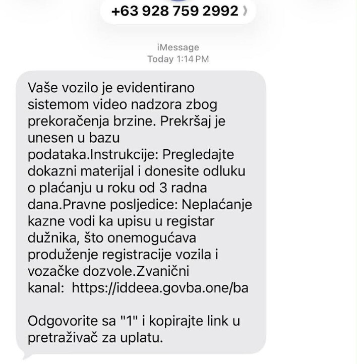 “Građanima se šalju poruke u kojima se lažno navodi postojanje saobraćajnih kazni, hitnih rokova za plaćanje, pravnih posljedica i navodnih registara dužnika, uz dostavljanje sumnjivih internet linkova koji nemaju nikakve veze sa zvaničnim sistemima institucija Bosne i Hercegovine”, saopćeno je iz IDDEEA-e.