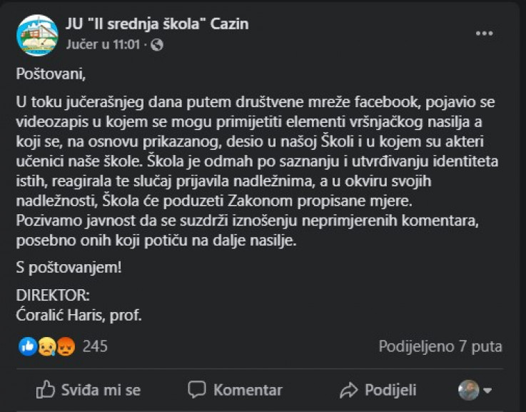 – U toku jučerašnjeg dana putem društvene mreže Facebook, pojavio se videozapis u kojem se mogu primijetiti elementi vršnjačkog nasilja a koji se, na osnovu prikazanog, desio u našoj školi i u kojem su akteri učenici naše škole. Škola je odmah po saznanju i utvrđivanju identiteta istih, reagirala te slučaj prijavila nadležnima, a u okviru svojih nadležnosti, Škola će poduzeti Zakonom propisane mjere. Pozivamo javnost da se suzdrži iznošenju neprimjerenih komentara, posebno onih koji potiču na dalje nasilje. S poštovanjem! Direktor, Ćoralić Haris – napisao je na Facebook profilu škole.