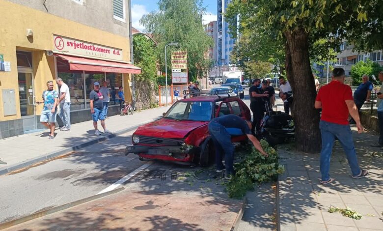Vozač golfa u centru Goražda sletio s ceste pa oštetio stabla i motocikl
